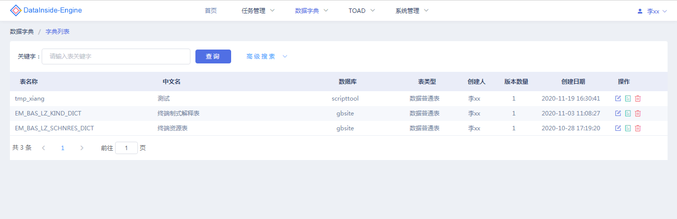 DataInside Engine API管理工具, 同时也将大数据中心的数据资产目录化, 并提供了版本管理能力. 系统开发方要使用数据, 可以先到目录中检索一遍, 有就直接使用, 没有再找大数据中心要. 同时, 我们还提供API版本管理的能力, 可以查询该接口的变动历史, 是什么原因要修改这个接口等信息, 这样即便接口变化, 对于使用老版接口的系统开发方来说, 也不会产生任何影响。