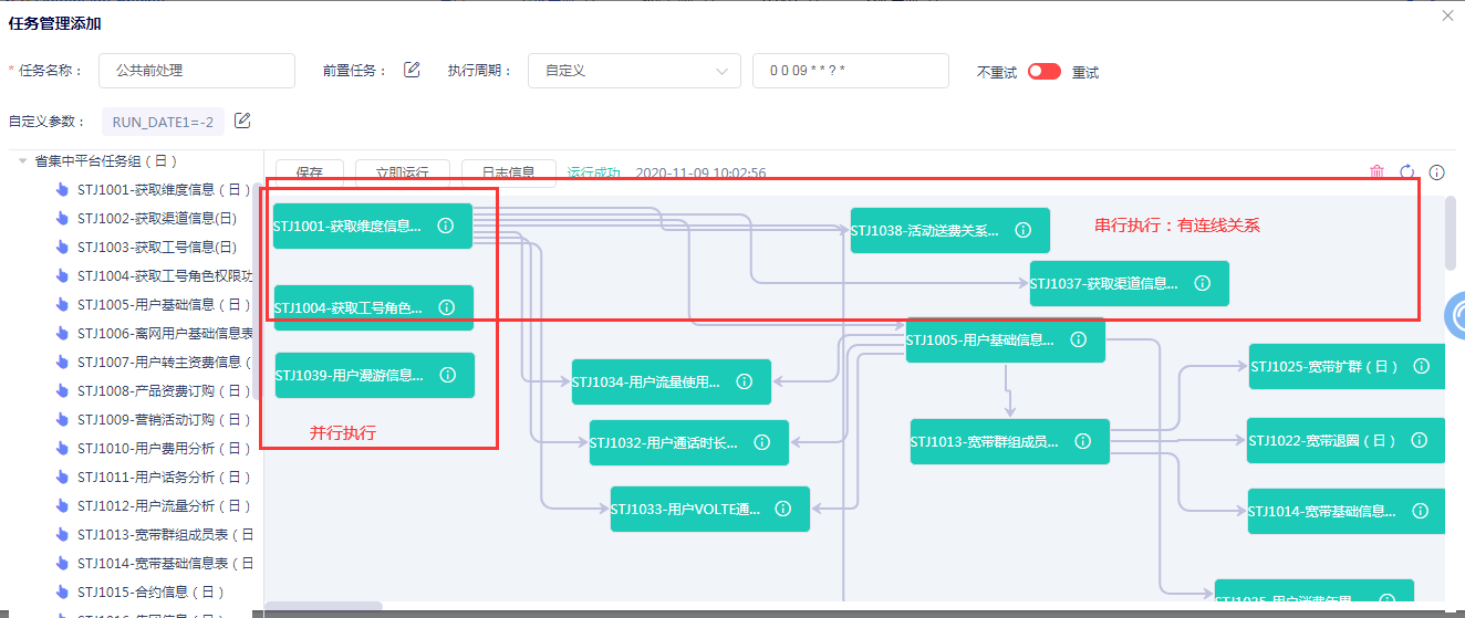 任务之间可配置依赖关系,各任务按依赖关系时序调度执行,如设置任务为前置任务,则该任务作为最优先运行,其它任务组需该任务组运行完后再依次运行,后续也可配置其它依赖关系。