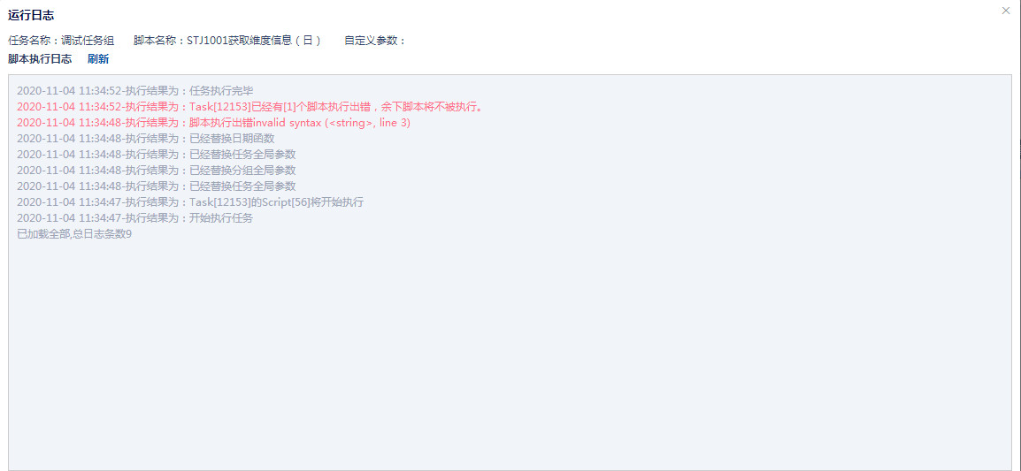 任务调度执行过程中,记录每一个任务中脚本运行的详细日志,包括任务名称、脚本名称、执行时间、参数、执行语句、执行结果,并可查看当前任务全局日志或单脚本日志,全方位监控任务调度的执行情况。